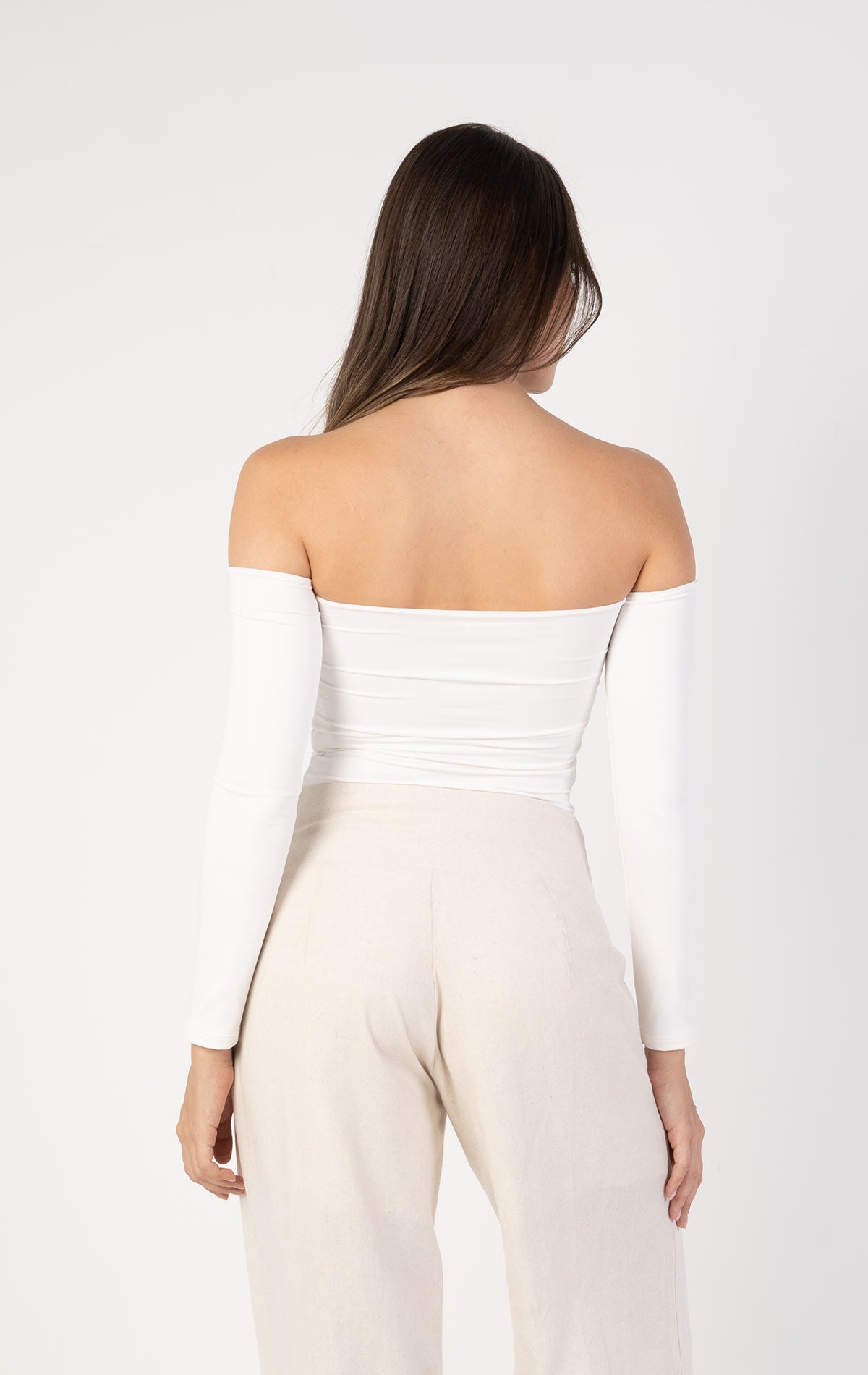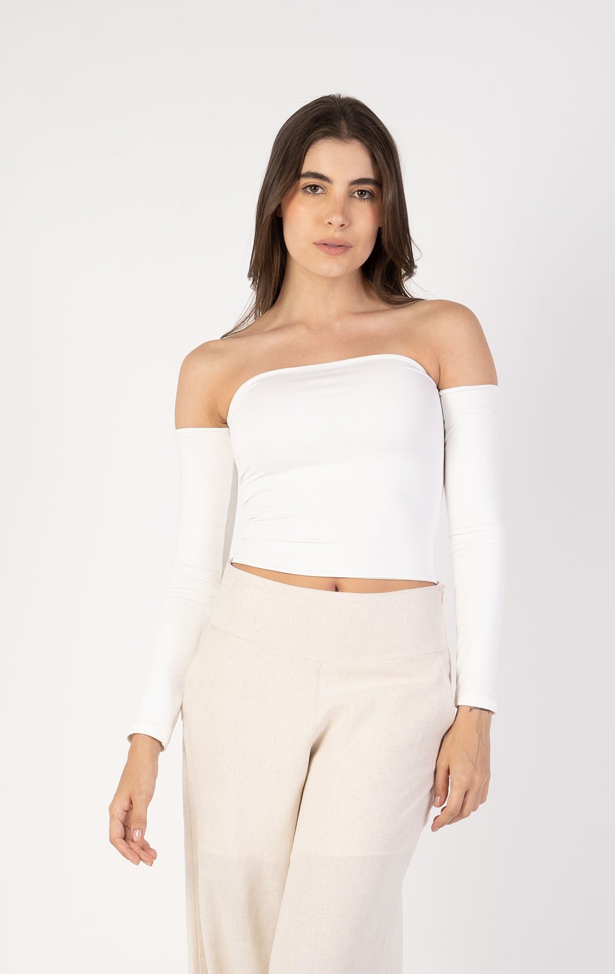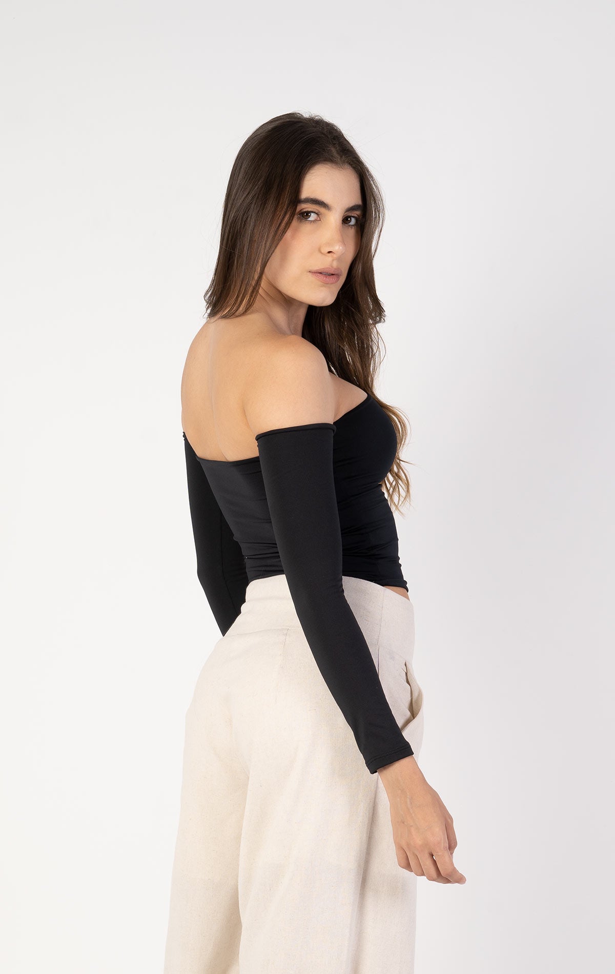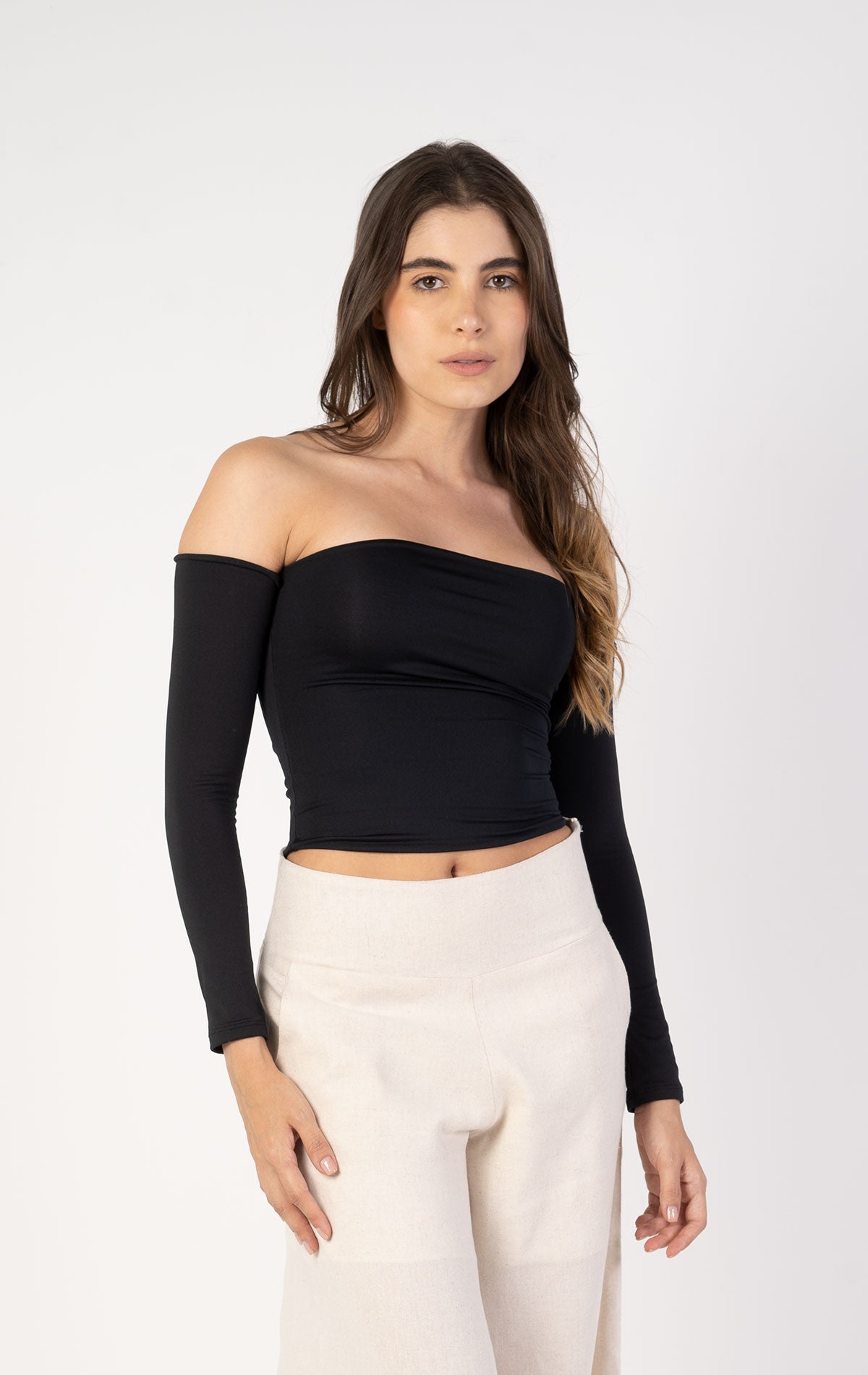 Diseñada en Lycra Poliéster Doble, ofrece comodidad, elasticidad y un acabado impecable. Sus mangas largas ajustadas complementan el diseño off-shoulder, aportando un toque elegante y moderno.
