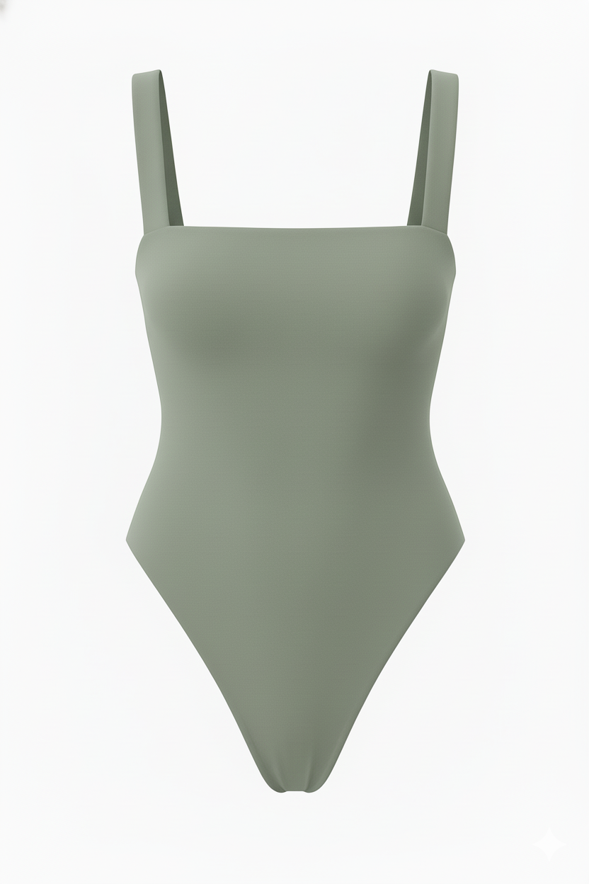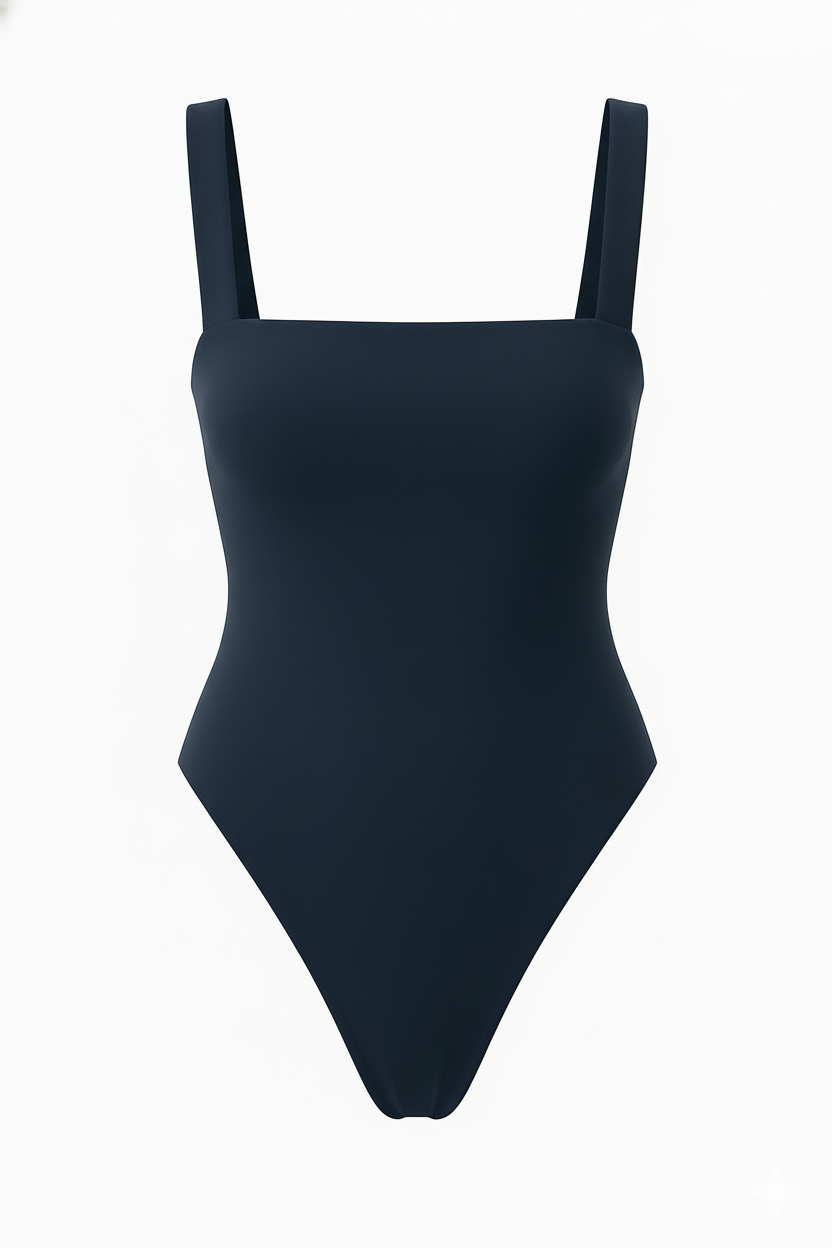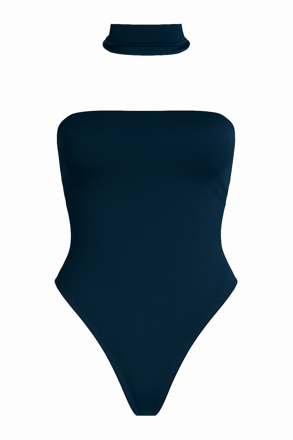 Body asimétrico de una pieza en licra suave de alto ajuste con aberturas laterales pronunciadas y escote central tipo keyhole. El detalle del sesgo blanco resalta los contornos y aporta contraste limpio y sofisticado.