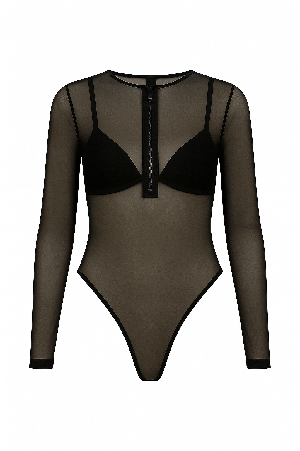 Body confeccionado en malla translúcida con top interno en licra para mayor cobertura y soporte. Presenta cuello alto con cremallera frontal funcional y mangas largas ajustadas. La parte inferior es tipo tanga con abrochadura ajustable, garantizando un ajuste cómodo y seguro. incluye el TOP BEBE.