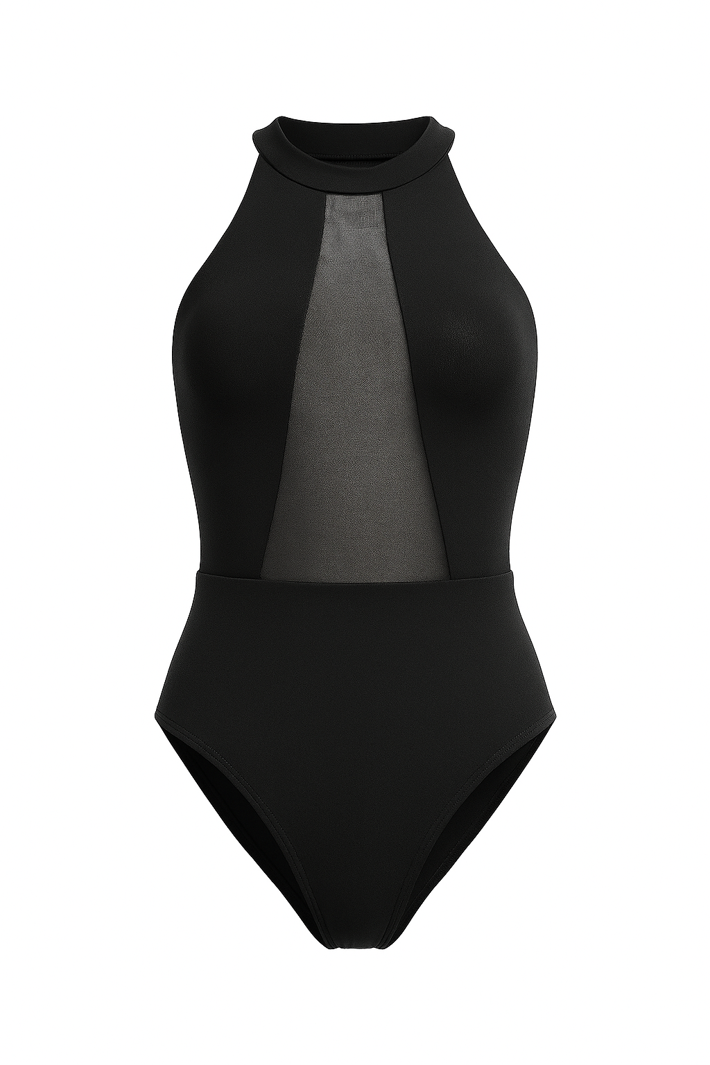 Elaborado en licra polyester excelente elongación y tacto suave. El diseño incluye cuello alto tipo halter y una panel frontal en malla translúcida en forma de triángulo invertido, que aporta un contraste moderno y sensual sin perder elegancia.