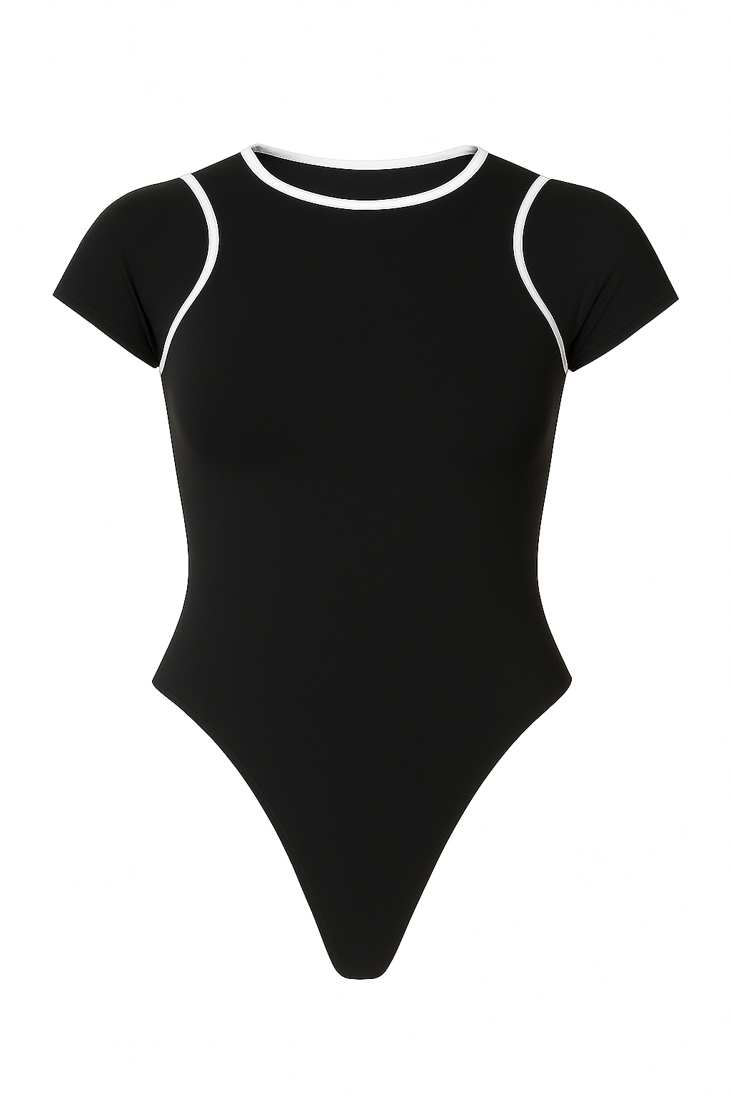 Body de silueta atlética confeccionado en licra poliéster. Diseño con cuello redondo, mangas cortas y detalles en sesgo que resaltan la estructura y aportan contraste. Corte alto en pierna para un efecto visual de piernas más largas. Parte inferior tipo tanga con broche ajustable, pensado para ofrecer comodidad y funcionalidad.