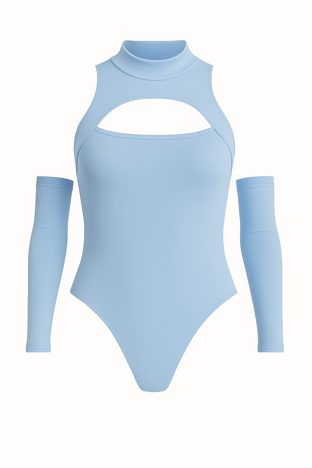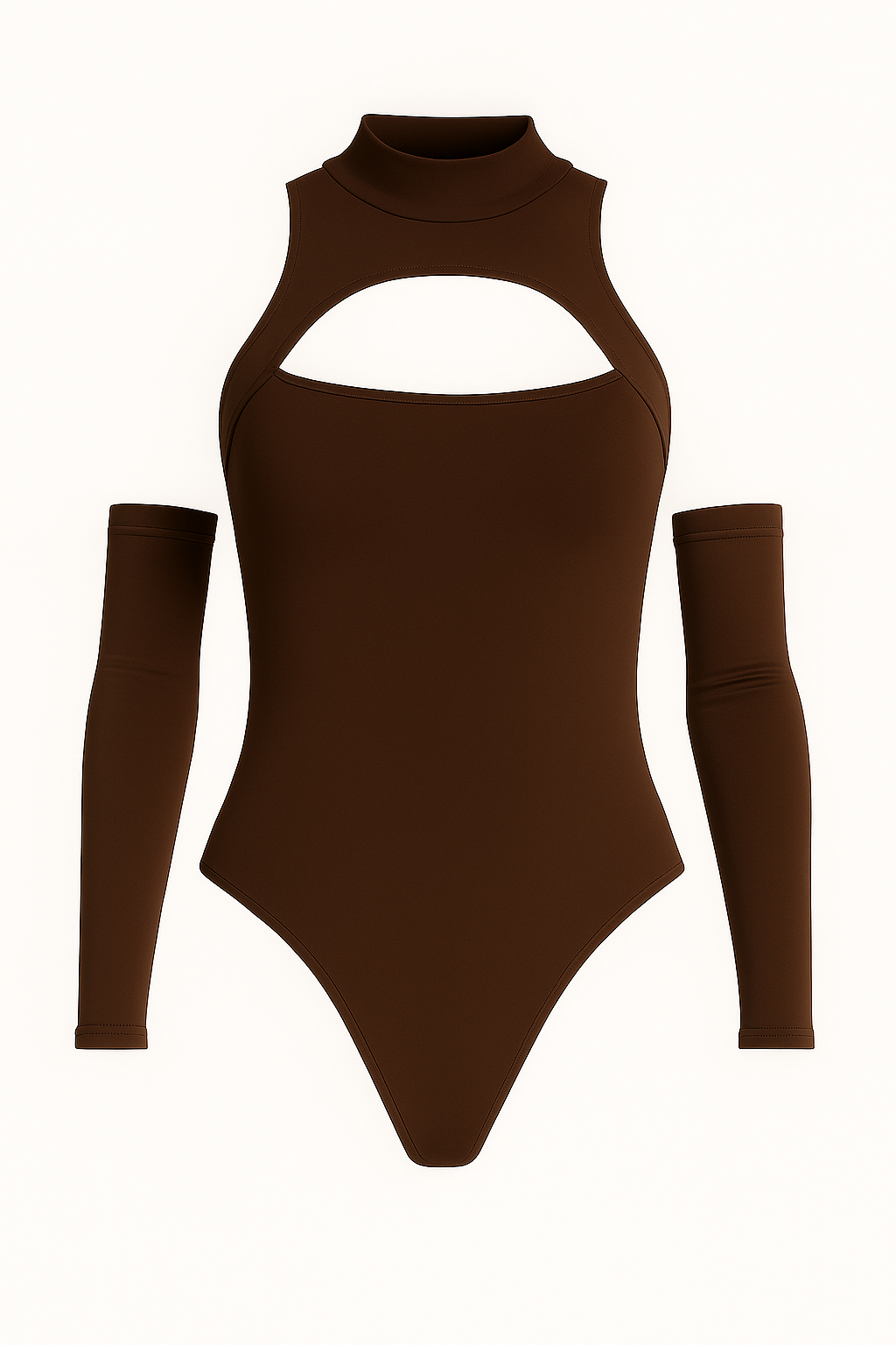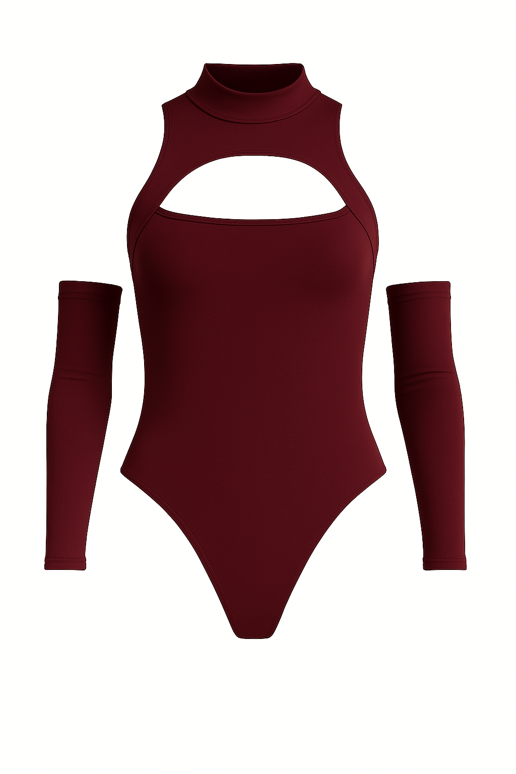 Body de diseño vanguardista confeccionado en licra poliéster . Presenta escote alto con abertura frontal tipo cut out que enmarca el busto de forma sutil. Mangas largas tipo guante que añaden versatilidad y un toque editorial al diseño. Corte limpio y silueta ceñida al cuerpo, con parte inferior tipo tanga y broche ajustable para mayor confort.