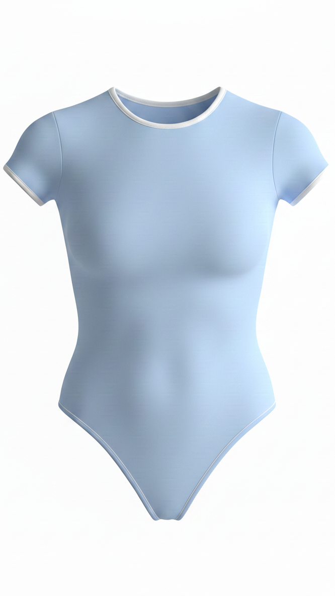 Body de silueta ajustada con manga corta y cuello redondo alto, ideal para un look limpio y estructurado. Su diseño minimalista se eleva con terminaciones en contraste en cuello y mangas, que aportan un detalle sutil pero diferenciador.