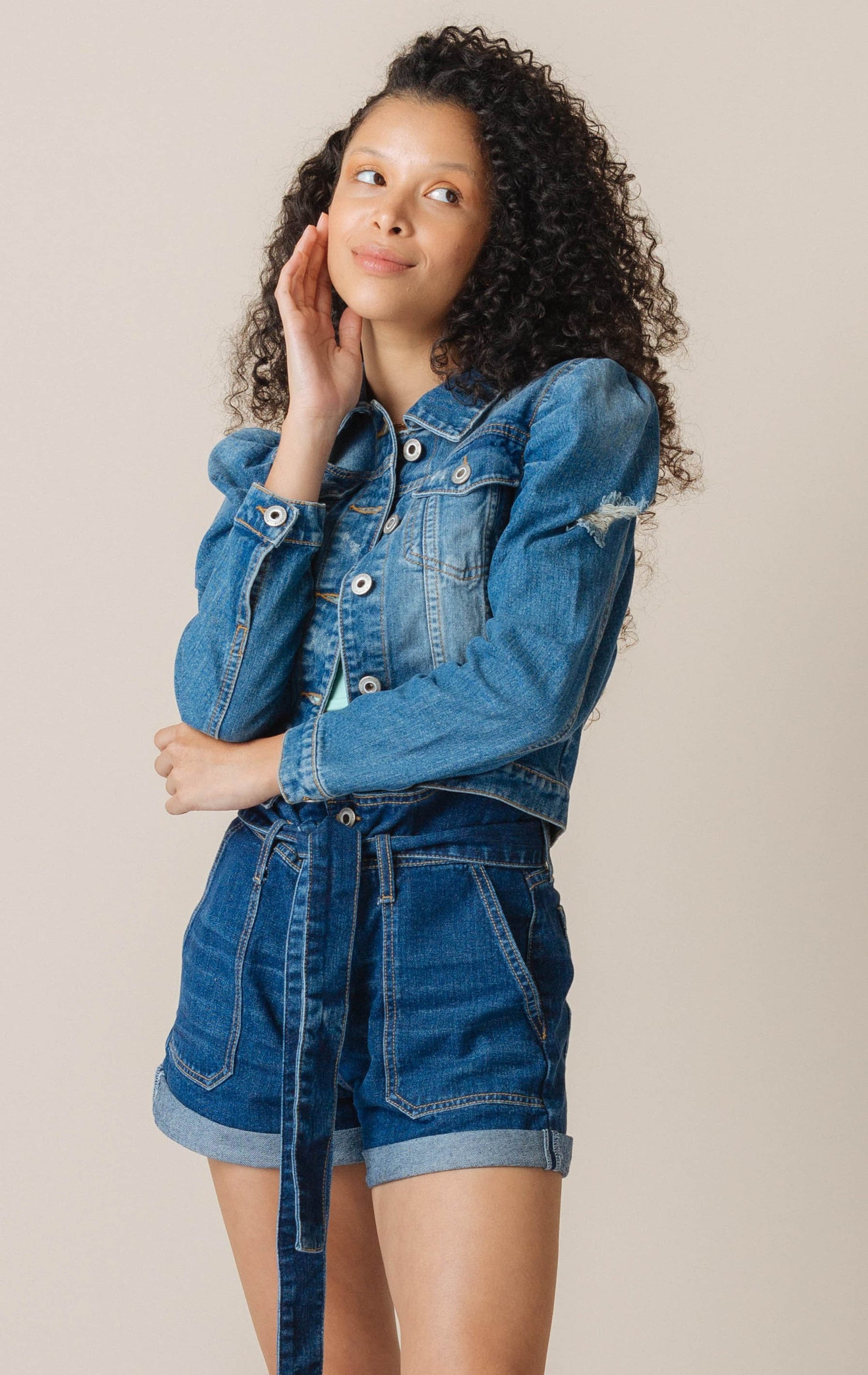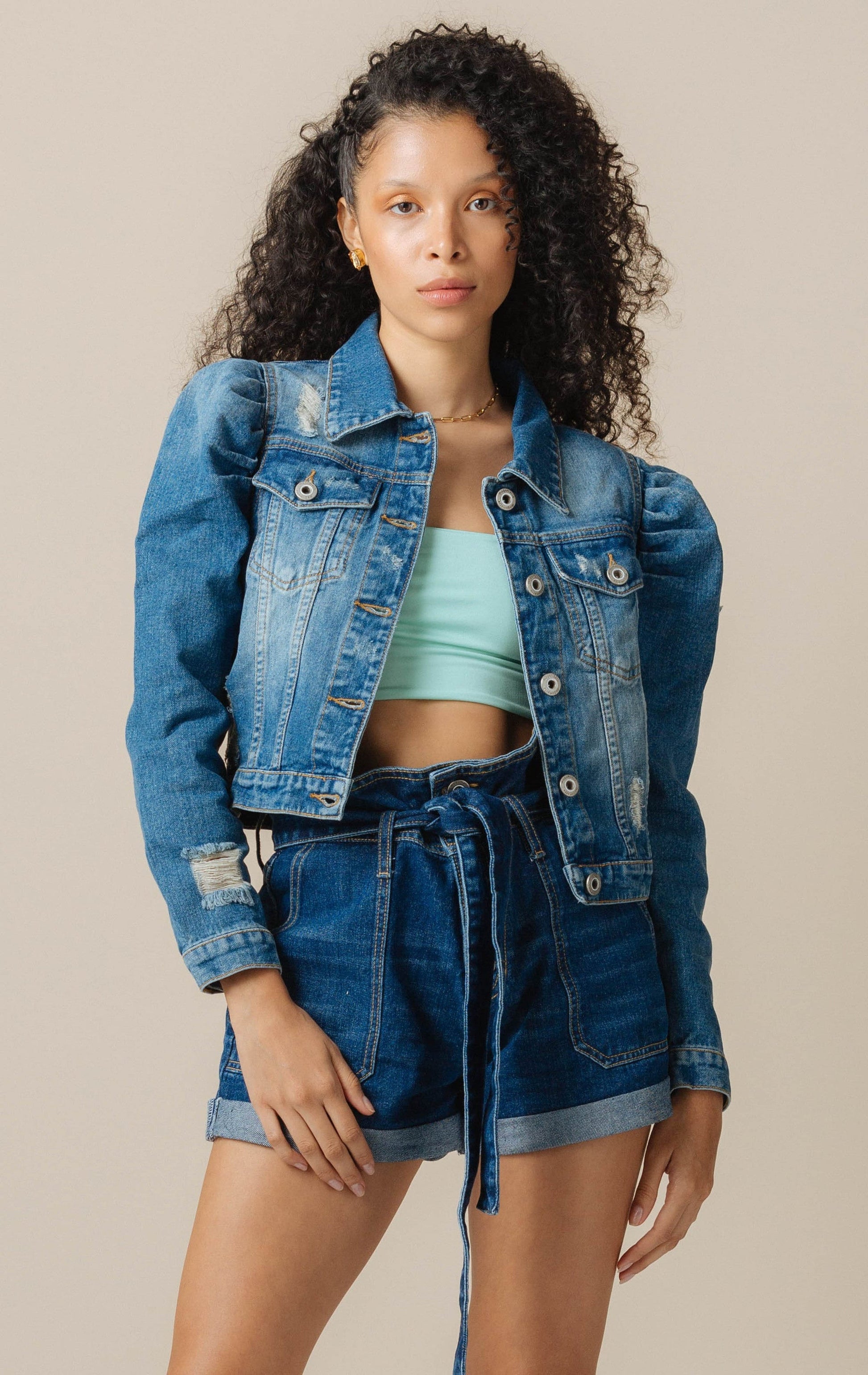 Chaqueta con los hombros en globo, bolsillos externos funcionales, cuello tipo WING y puño con botones.