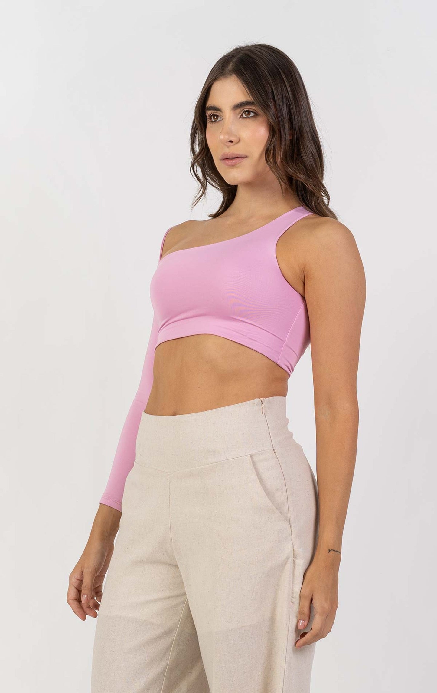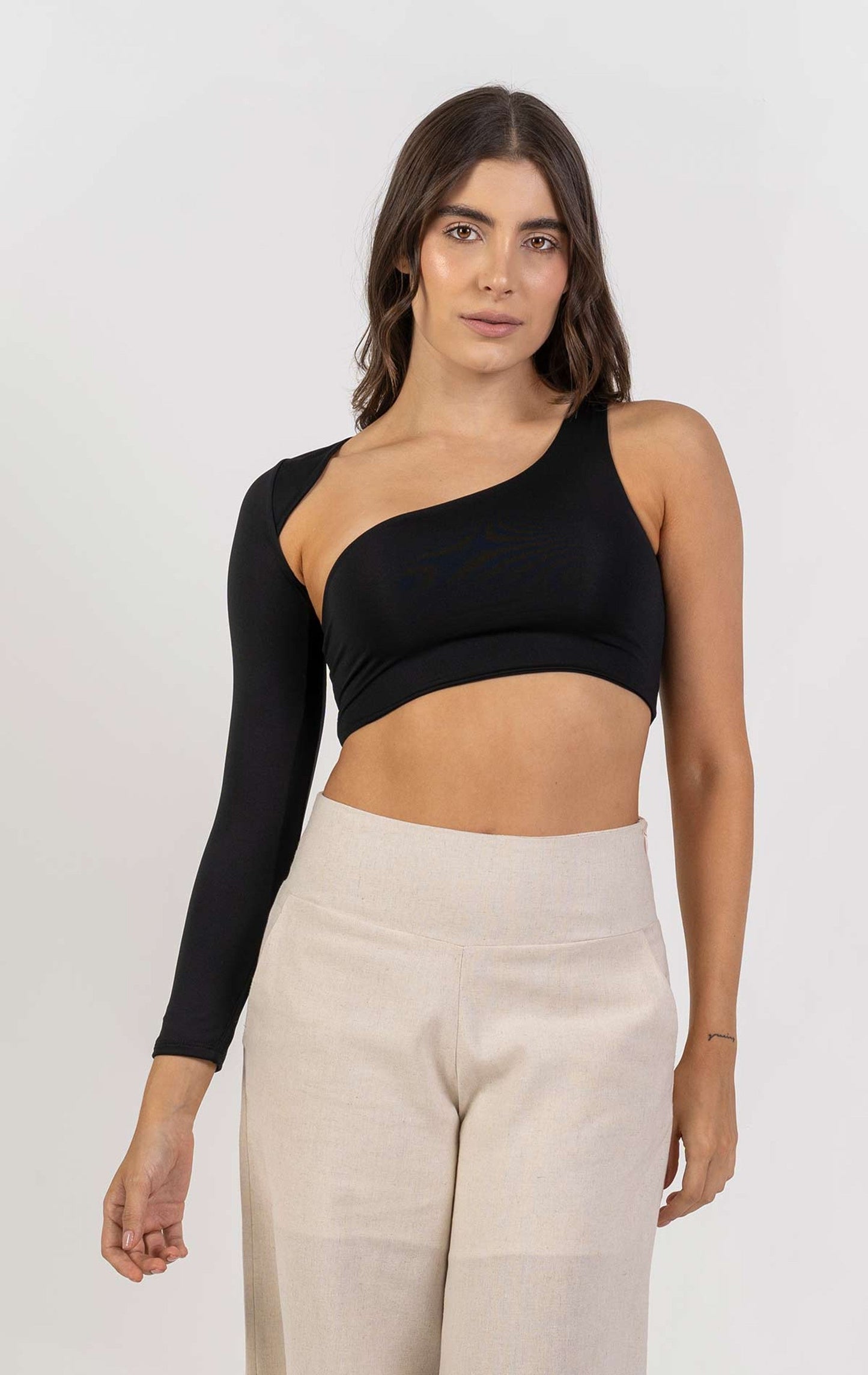 Crop top asimétrico de manga larga y escote posterior.