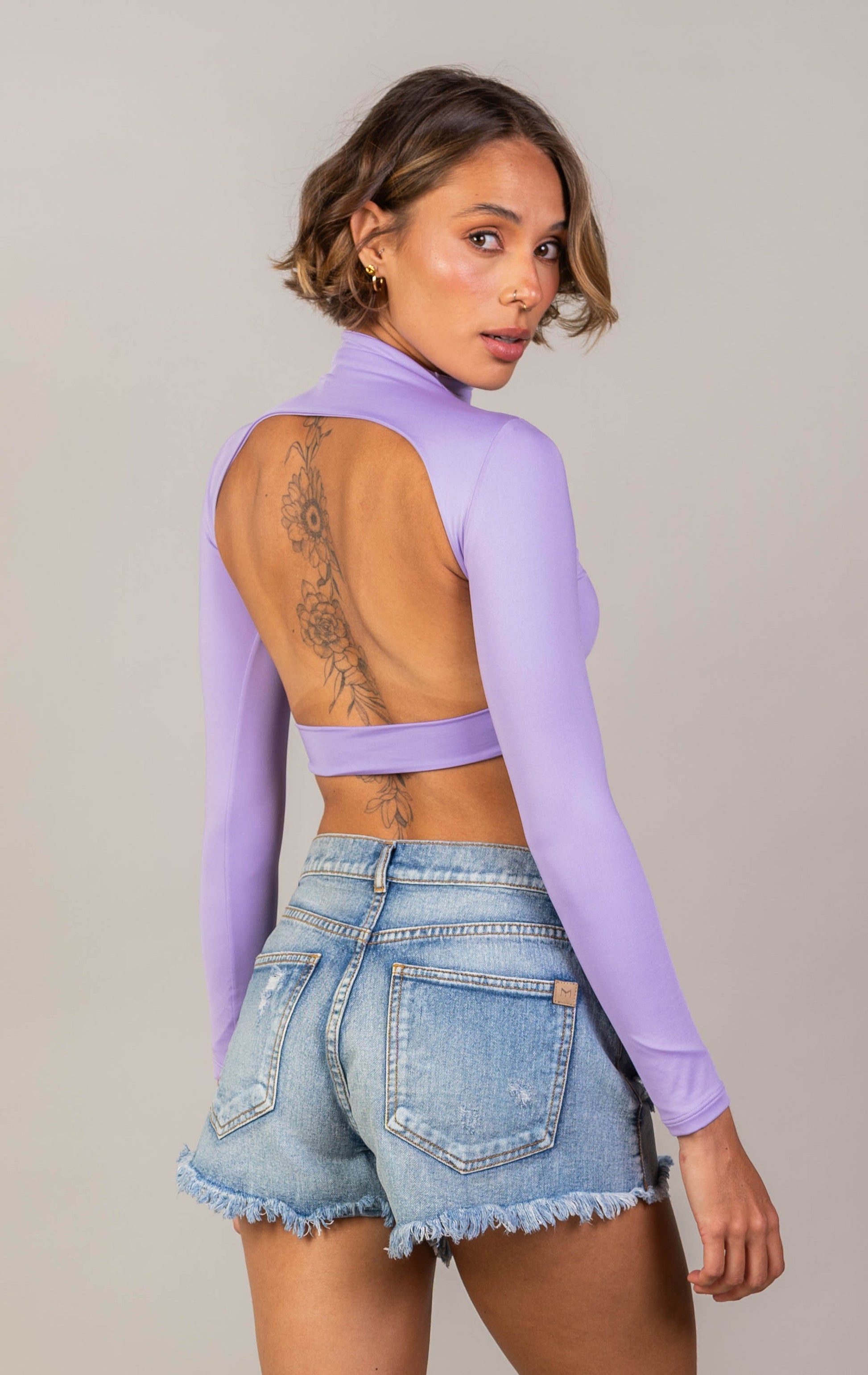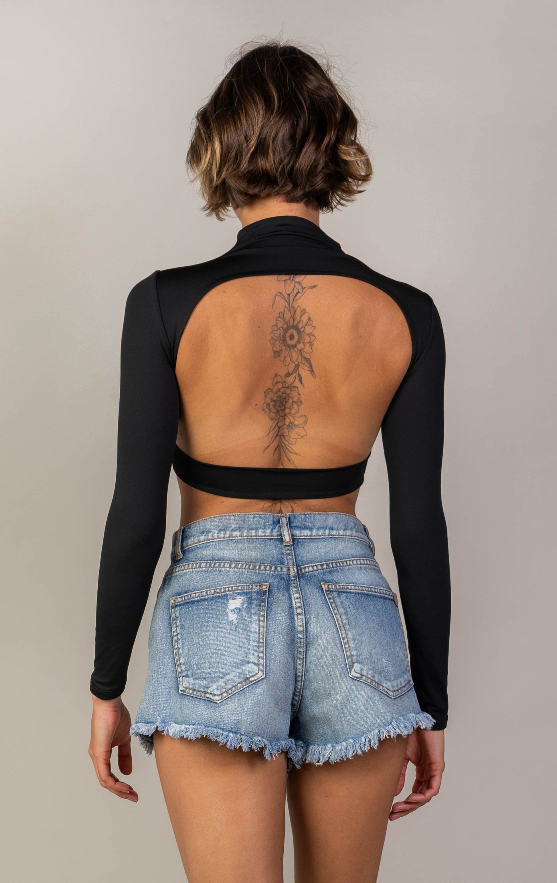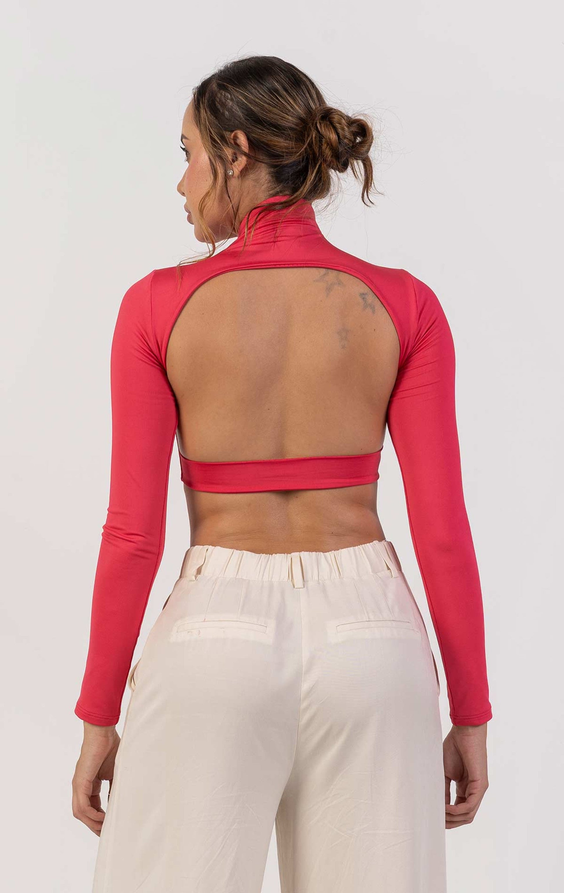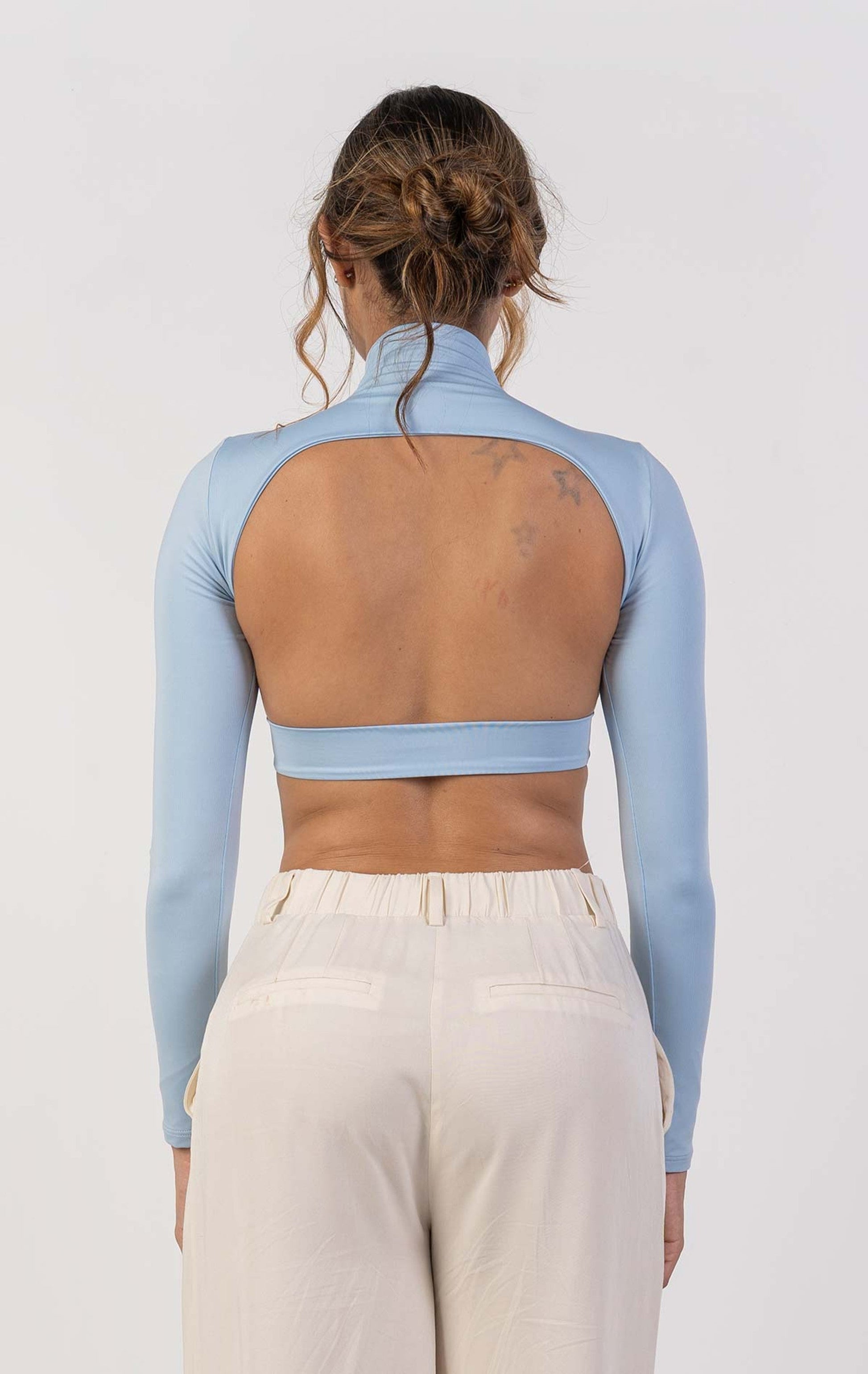 Crop top de cuello alto, mangas largas con escote posterior.