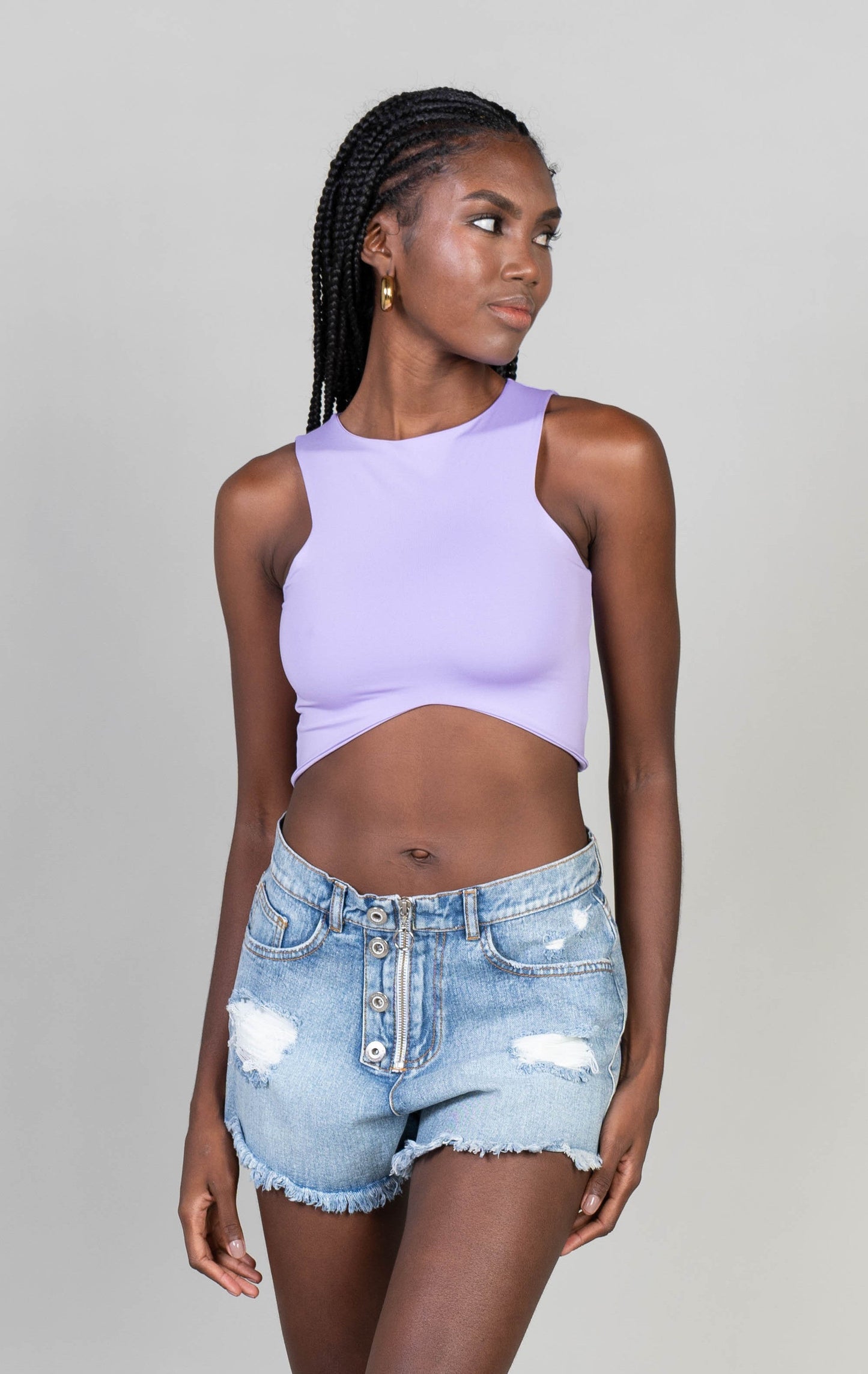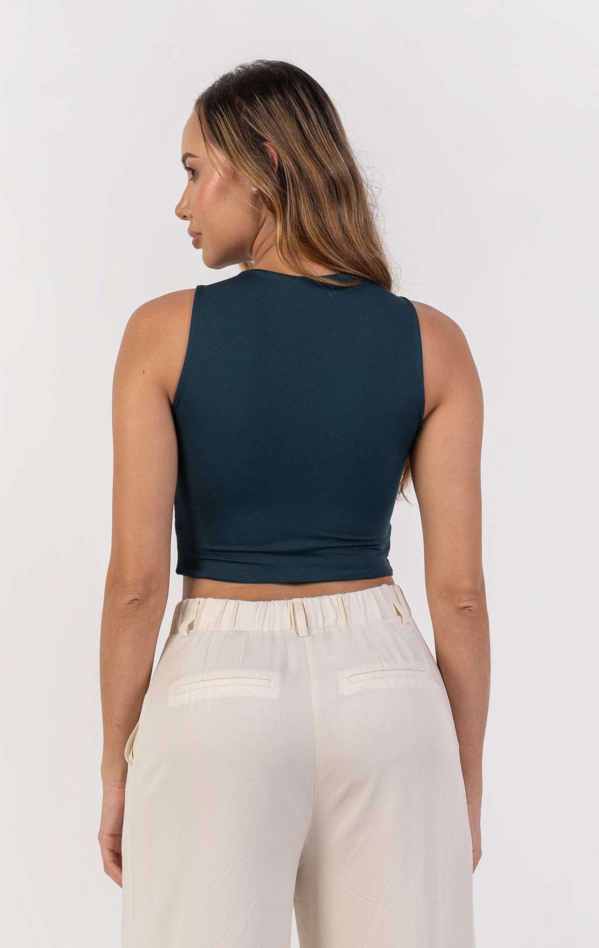 Crop top básico, sin mangas con corte en la parte inferior y sisa triangular.