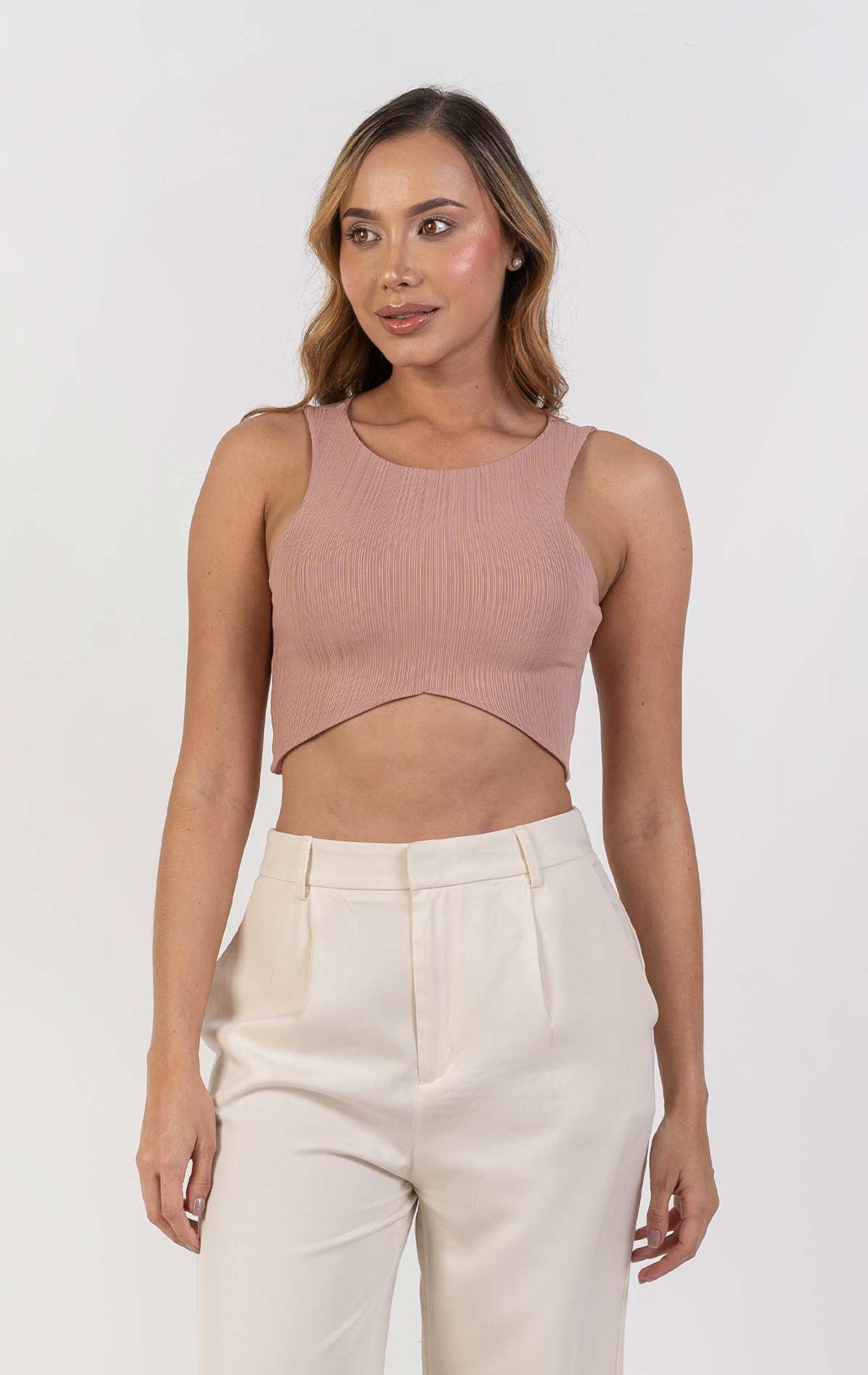 Crop top básico, sin mangas con corte en la parte inferior y sisa triangular.