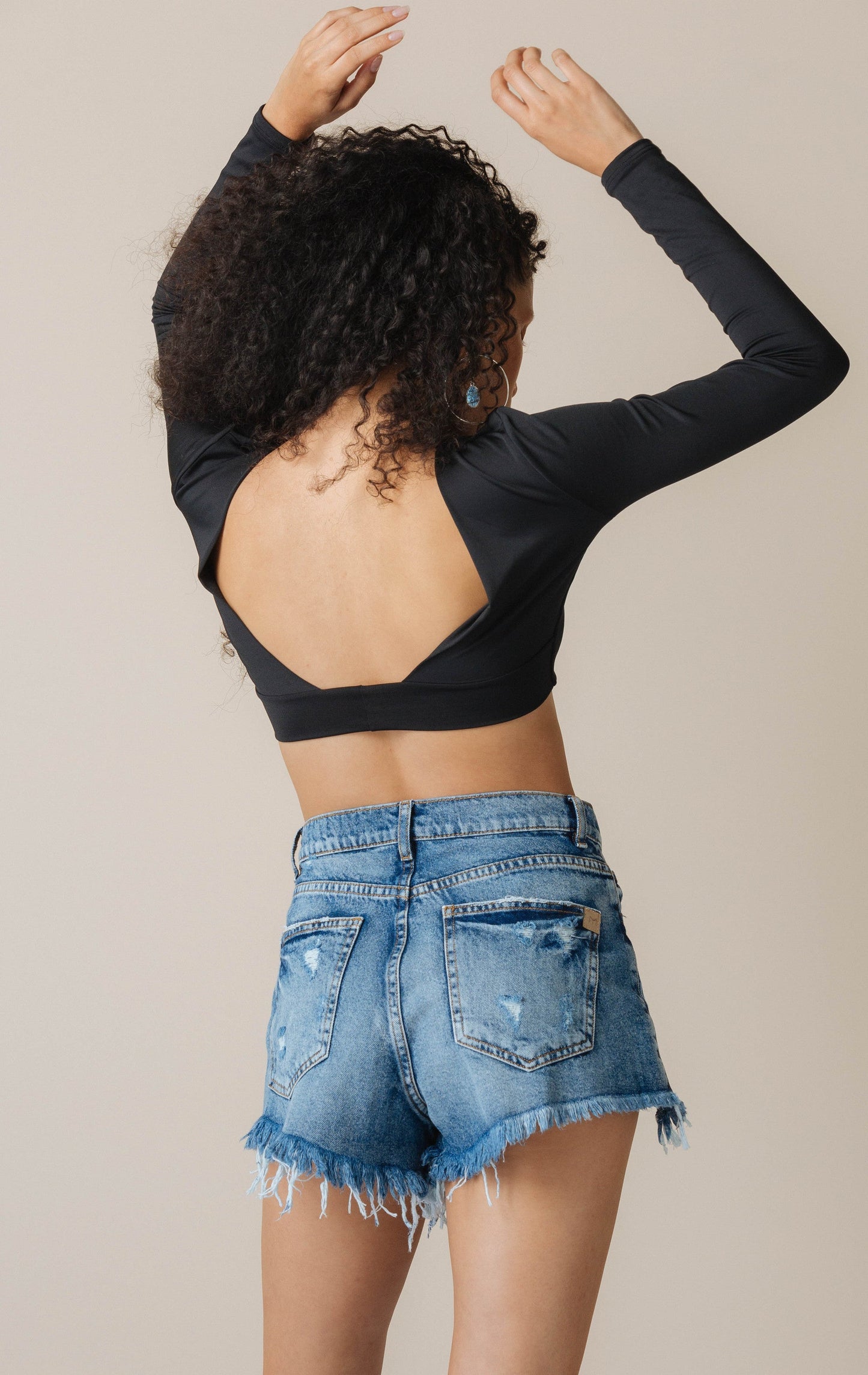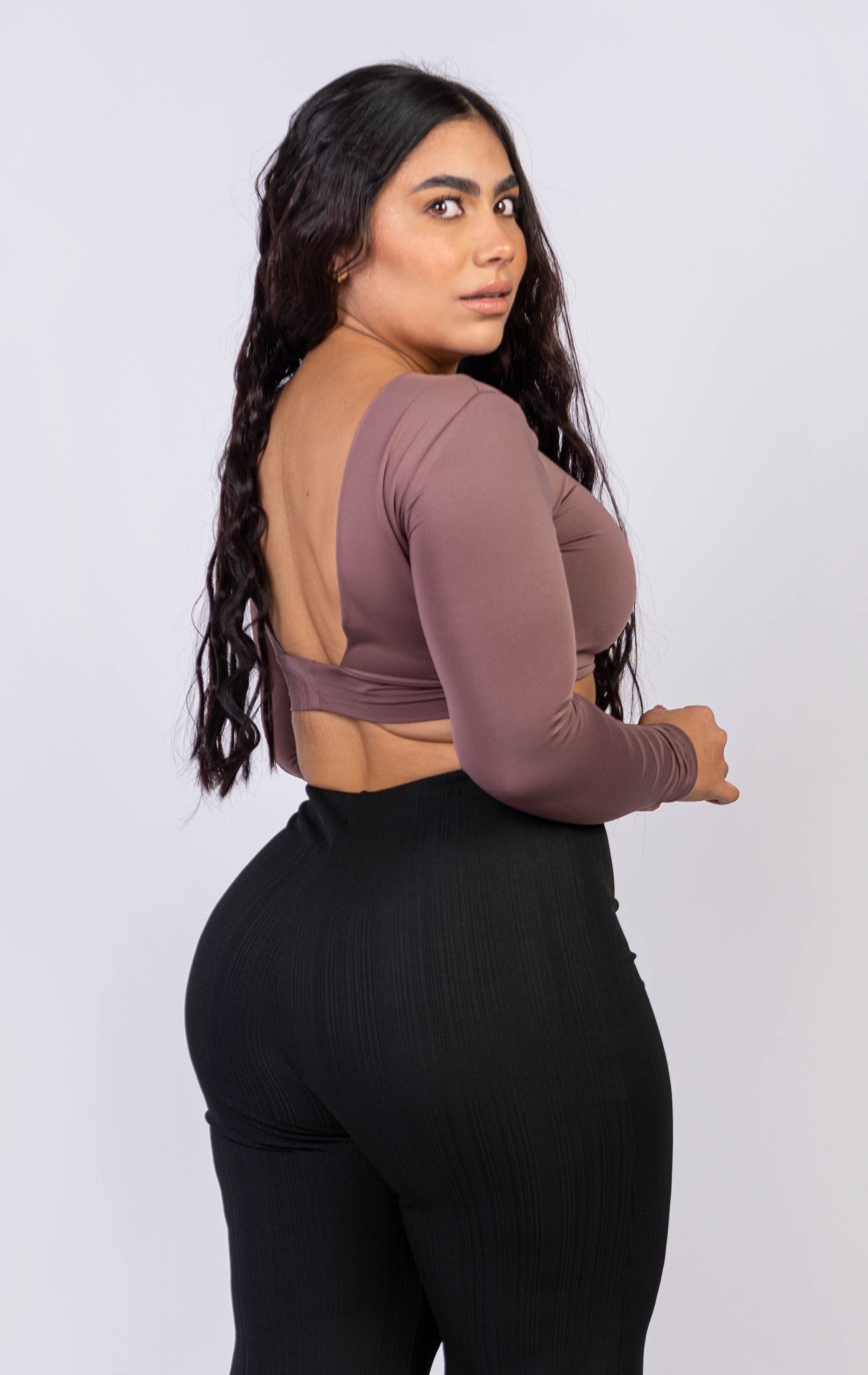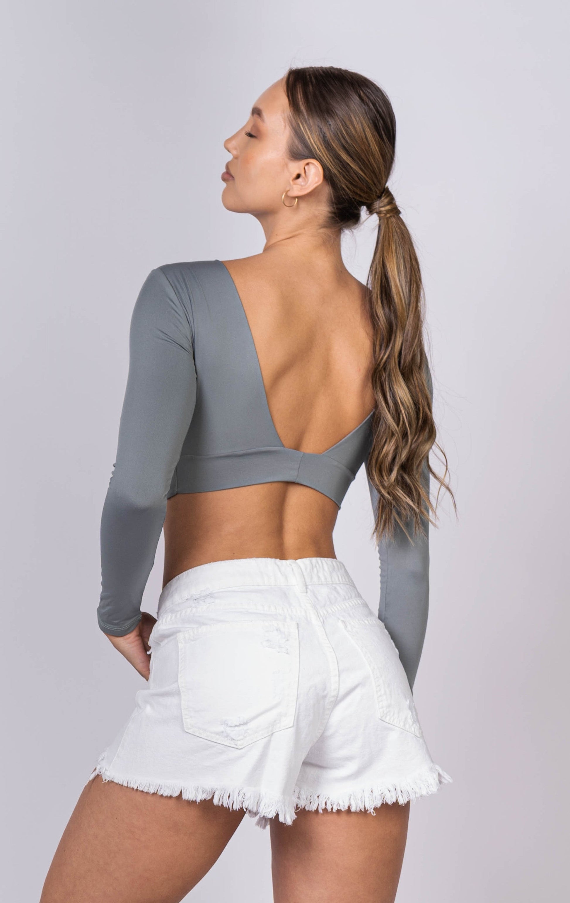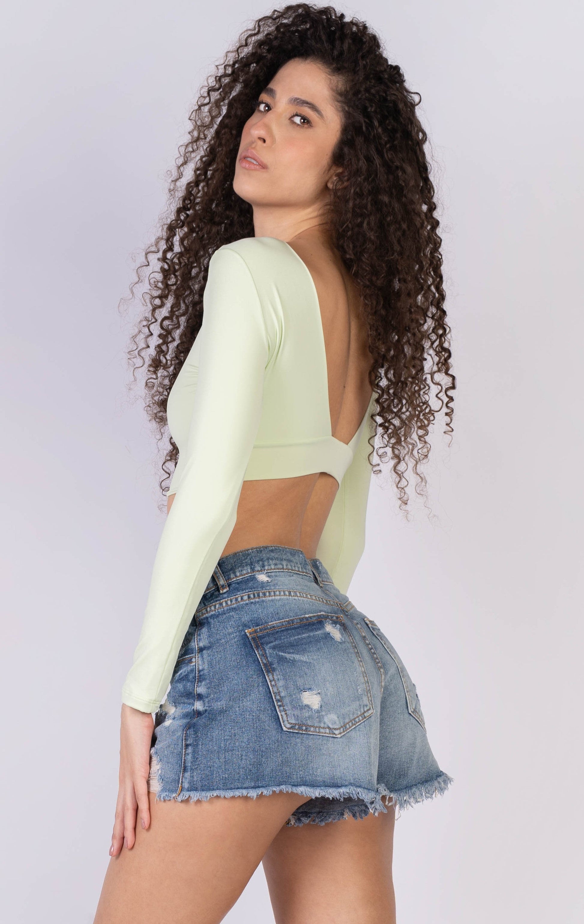 Crop top mangas largas con escote en V en la parte posterior.