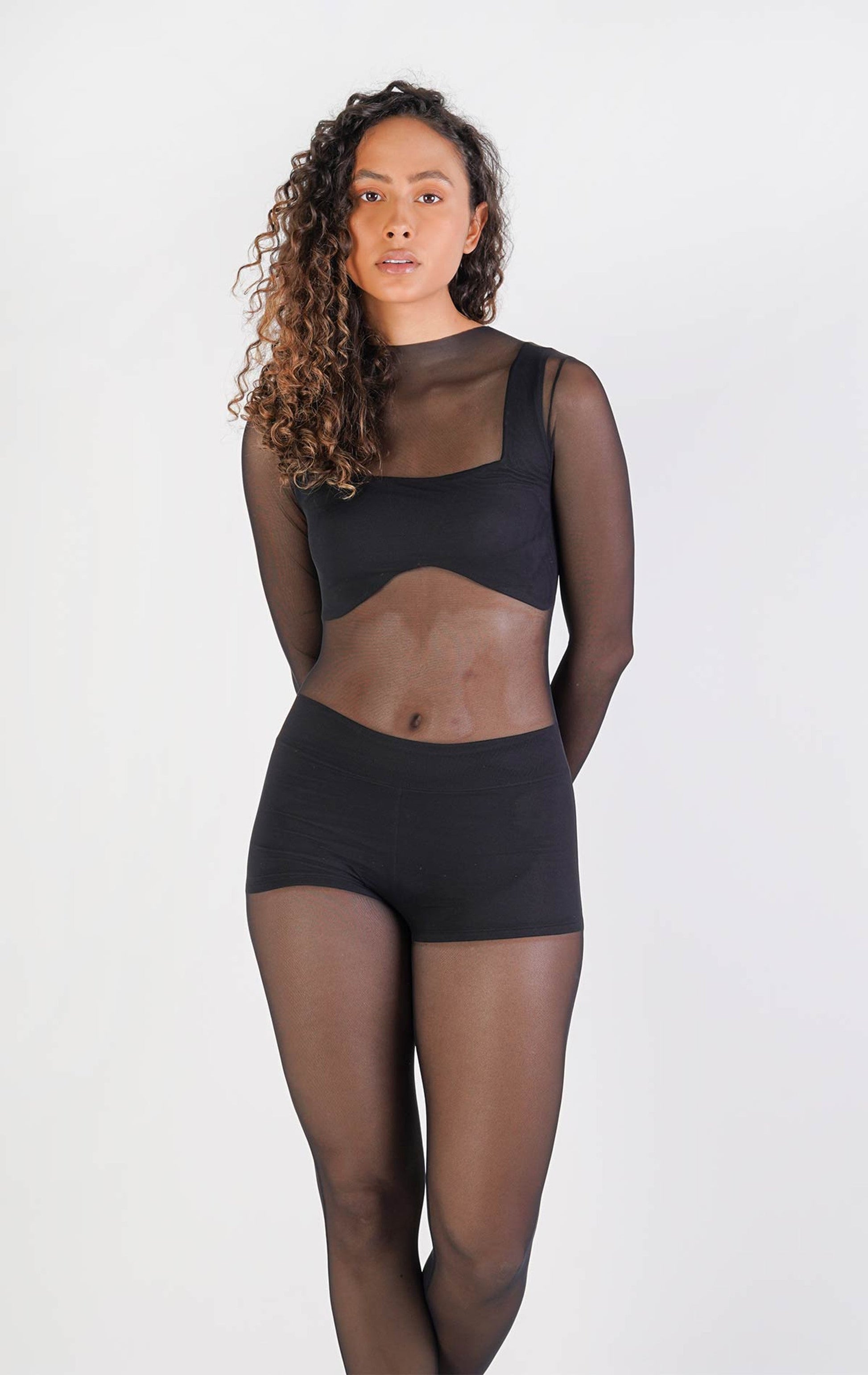 Enterizo mangas largas en transparencia y cierre invisible posterior.
