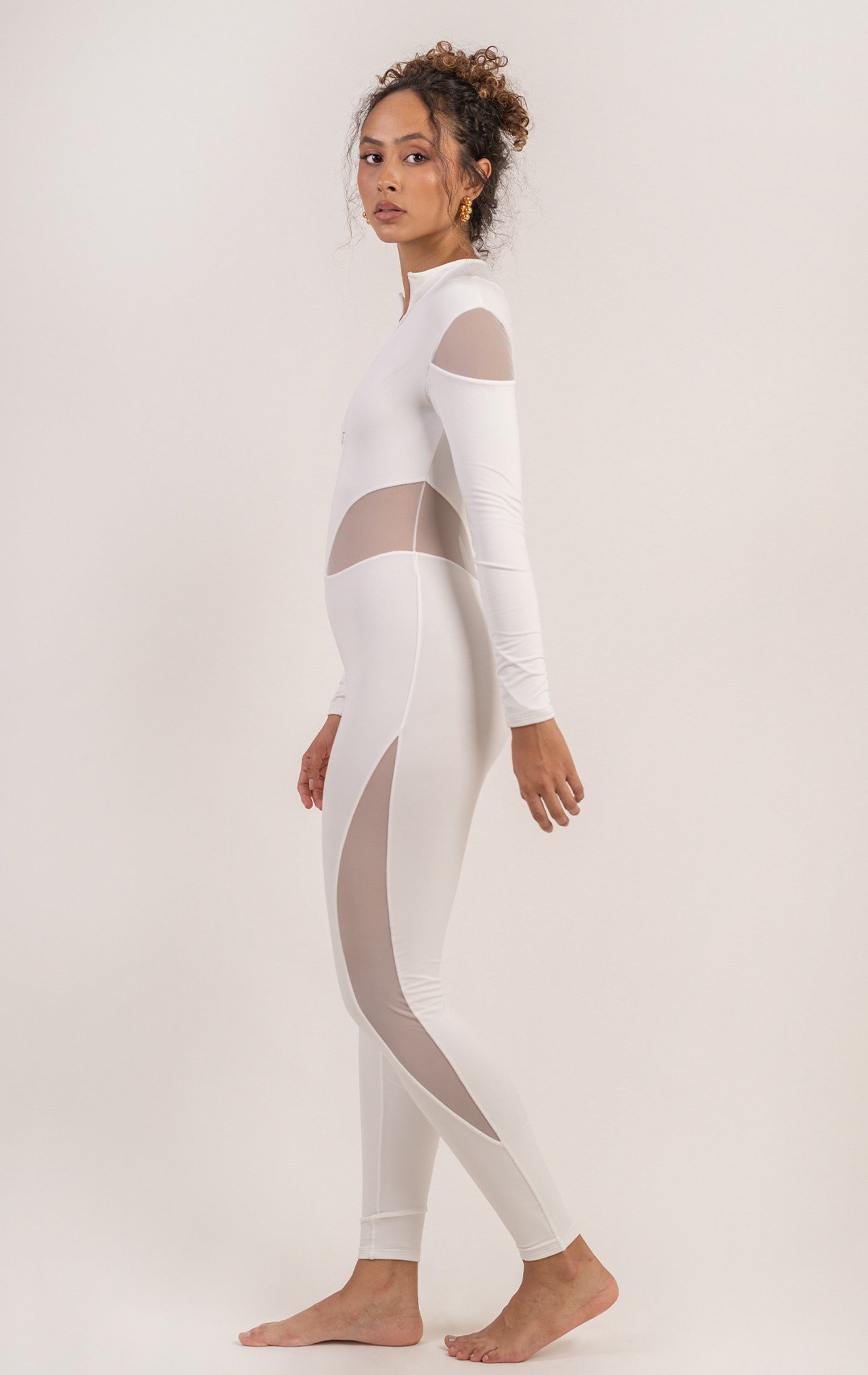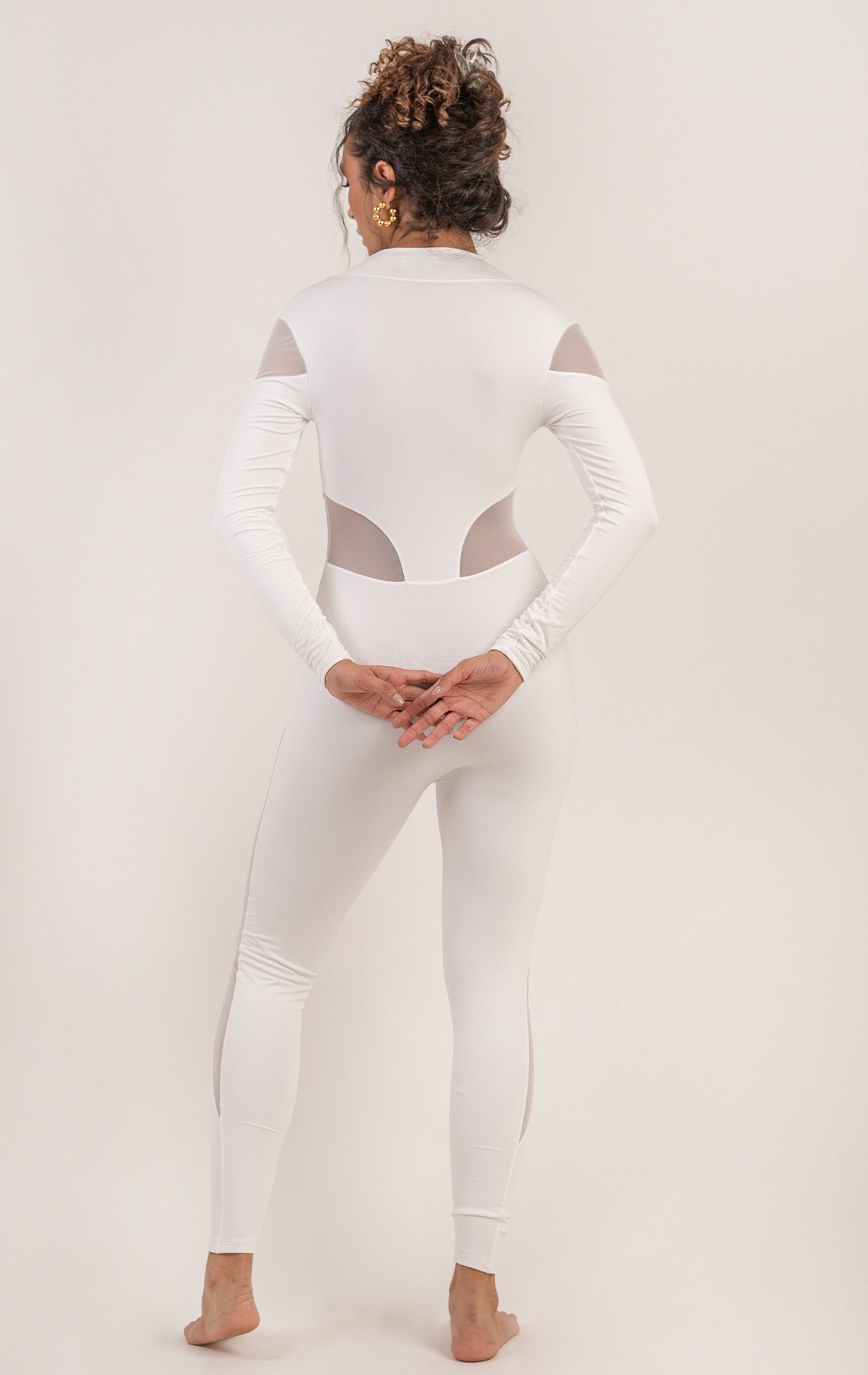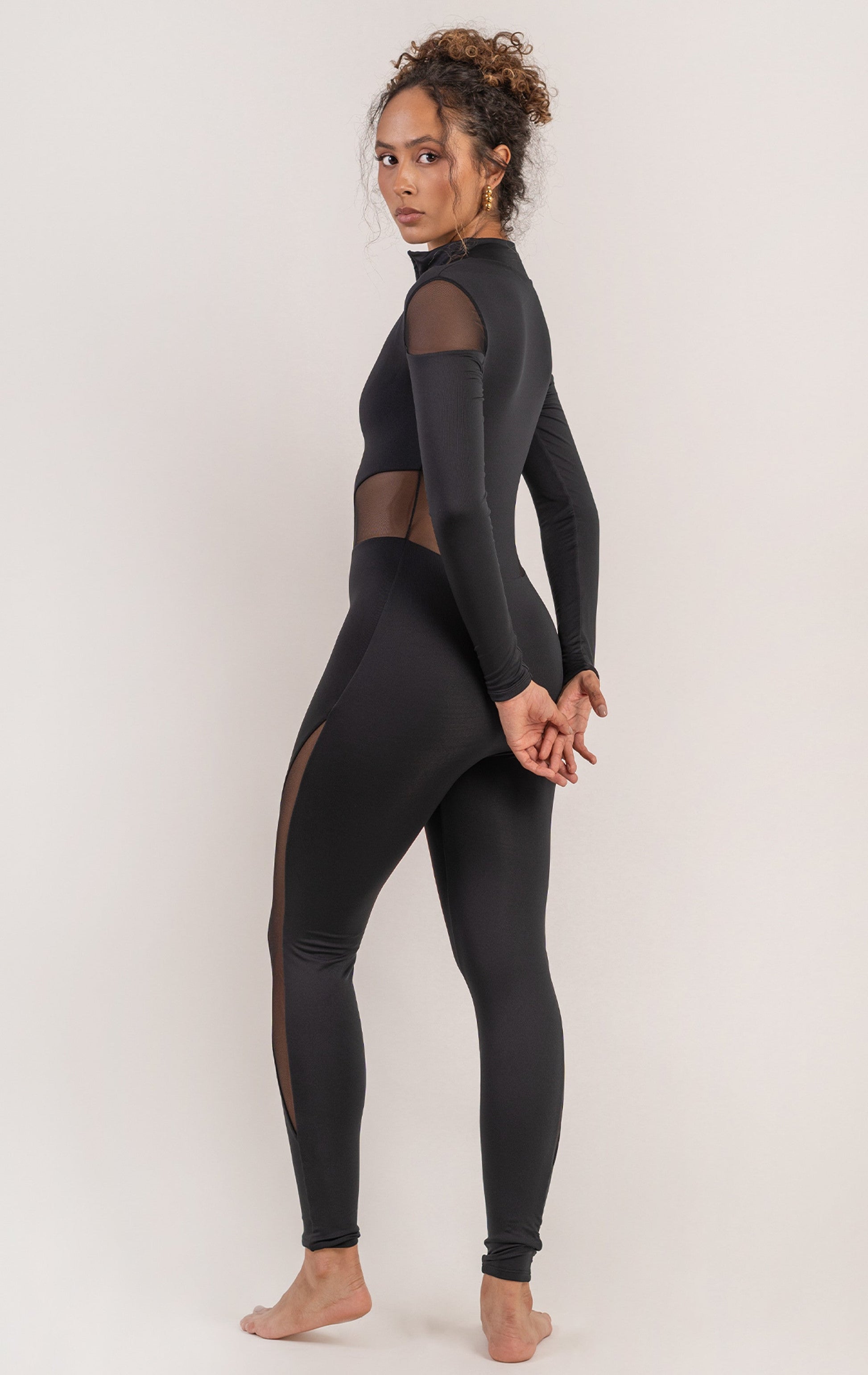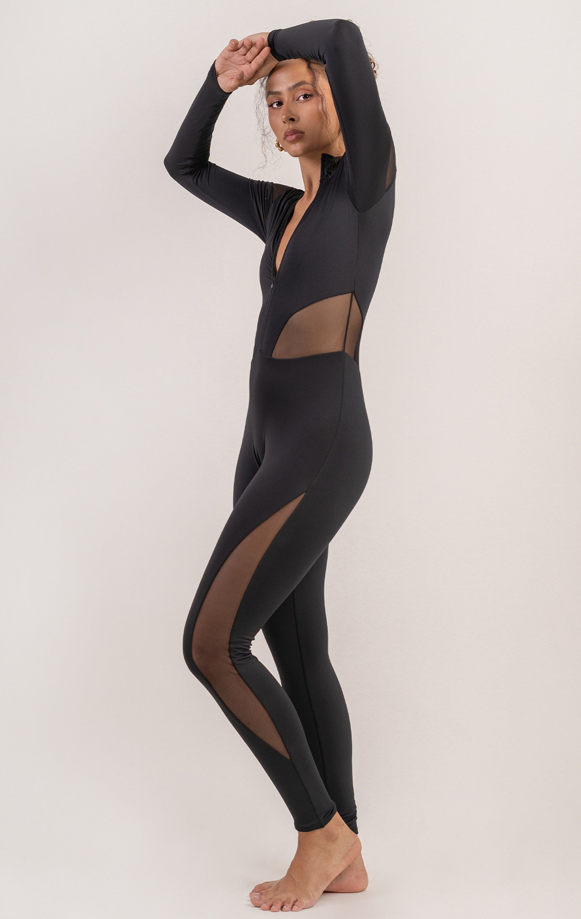 Enterizo mangas largas, escote con cremallera y cuello, transparencia en costados y hombros.