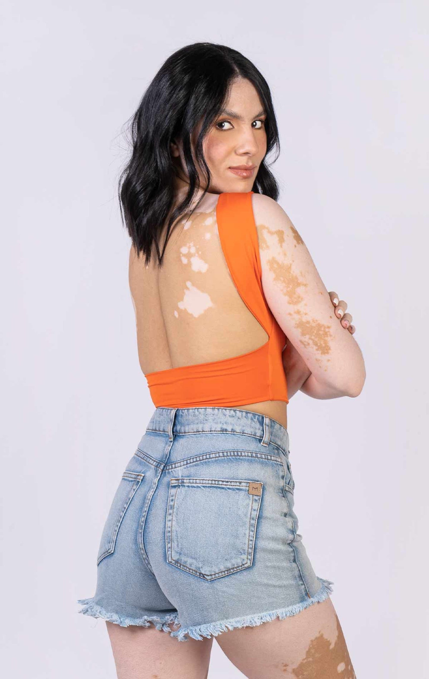 Short básico de tiro alto con bolsillos funcionales, ajustado y ruedo rústico.
