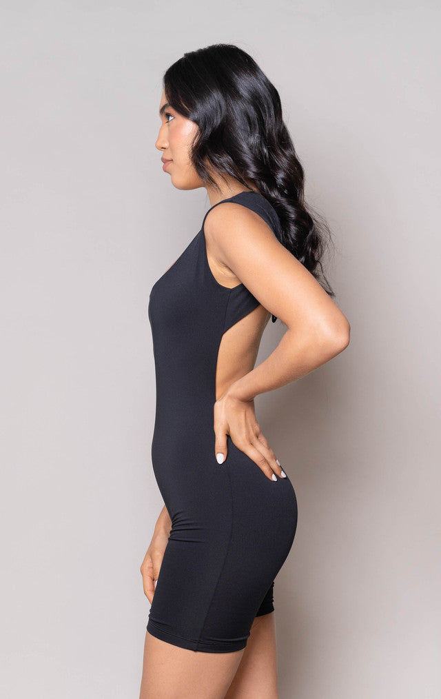 Enterizo corto de escote cuadrado, manga sisa y amarre posterior.